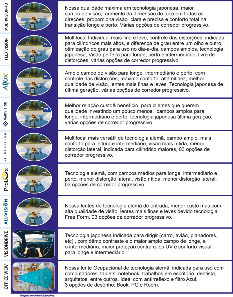 Todas as lentes com controle de distorções, Visão aprimorada, adaptação imediata, mais finas, leves e melhor qualidade óptica.